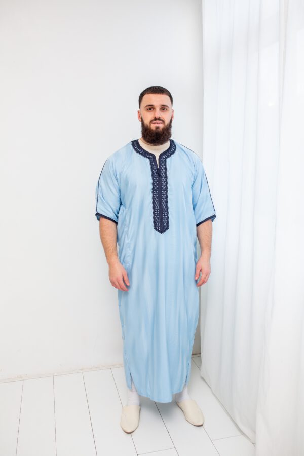 Ben jij opzoek naar een luchtige Kandora? Dan is dit de Kandora waar jij naar opzoek bent! ‘’Sky Kandora’’ heeft korte mouwen en hoogwaardige borduursel op de borst. Hij is voorzien van een zak aan de rechterkant en een opening in de linkerzak.